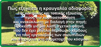 γ- Όσους θα διαχωρίζουν τα σκουπίδια τους κατά είδος (χαρτί, γυαλί, μέταλλα, οργανικά κ.λ.π.). Αυτοί θα μοιράζονται το χρηματικό ποσό από το επιβαλλόμενο Δημοτικό Τέλος στους πρώτους ανάλογα με την ποσότητα και την αξία των διαλεγμένων σκουπιδιών που παραδίδουν.